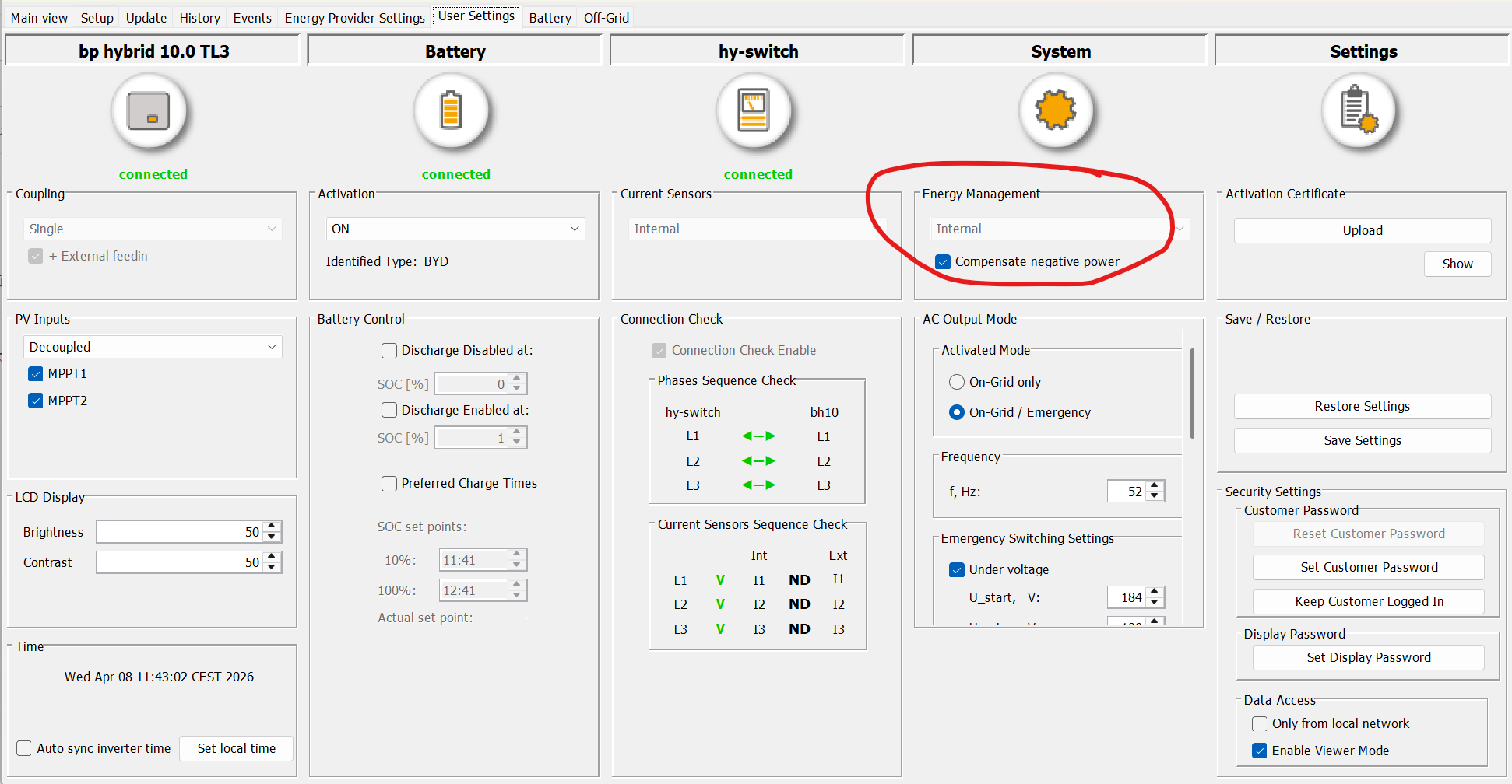 Zusätzlich im Anhang ein Screenshot des KACO hy-sys. Hier sieht man, dass unter System das Energy Management auf „internal“ steht. Bewirkt diese Auswahl, dass das interne Management System Vorrang vor dem Modbus/TCP hat? Die Option ist ausgegraut und kann nicht geändert werden.