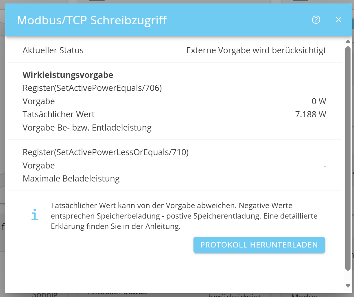 Im Live-Monitoring wird untzer Modbus/TCP Schreibzugriff „Externe Vorgabe wird berücksichtigt“ angezeigt, und die geschriebenen Werte erscheinen korrekt in der Detailansicht, siehe Bilder im Anhang. Die Entladung des Speichers wird jedoch nicht beeinflusst.