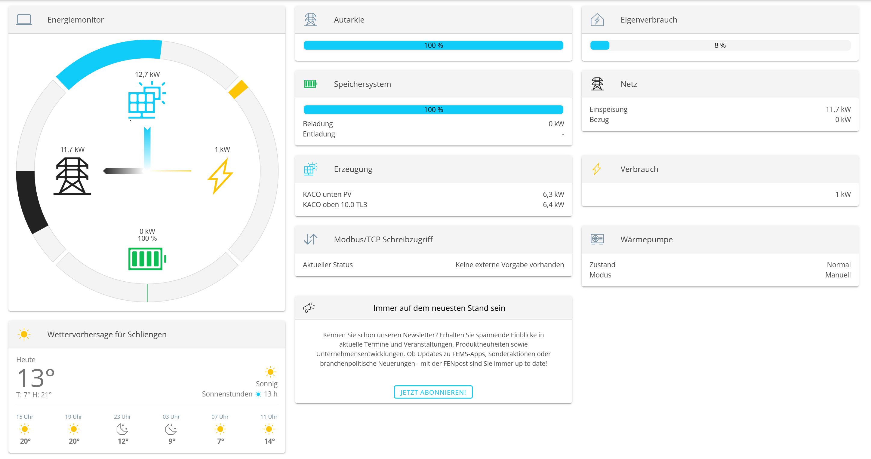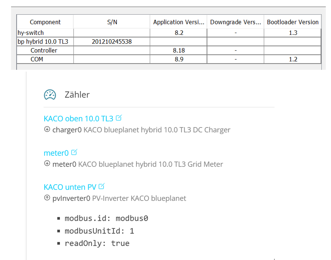 ich habe 2 KACO Wechselrichter mit Kaco Hybrid 10.0 TL3. Gestern habe ich dem die Lizenz für die Fems-App „Modbus/TCP Schreibzugriff“ erworben und installiert, die App ist auf dem Fems-Dashboard zu sehen.