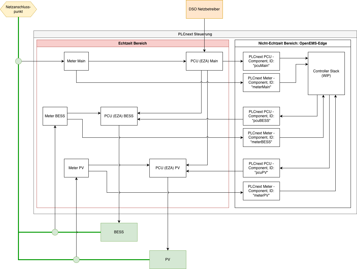 Ok, das heißt ihr möchtet (1.) die Daten aus PLCnext in OpenEMS Devices mappen - z. B. ein meter für den Netzzähler, ess für einen Speicher etc. und (2.) dann Regelungsalgorithmen darauf anwenden, die u.A. auch die EZA-Regler-Limits einhalten.